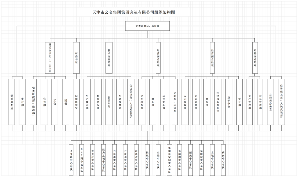 天津市公交集团第四客运有限公司,是隶属于天津市公共交通集团(控股)有限公司的全资子公司,始建于1976年5月。公司自成立以来,始终秉持着“服务百姓 方便出行”的宗旨,不断强化企业经营管理,深化体制机制改革,加强文化建设和人才培养,形成了以运营、安全、服务为中心的管理体系。截至2024年底,公司在册职工2934人,运营线路115条(不含定制公交),在册运营车辆1054部,线路总长度2276.45公里。