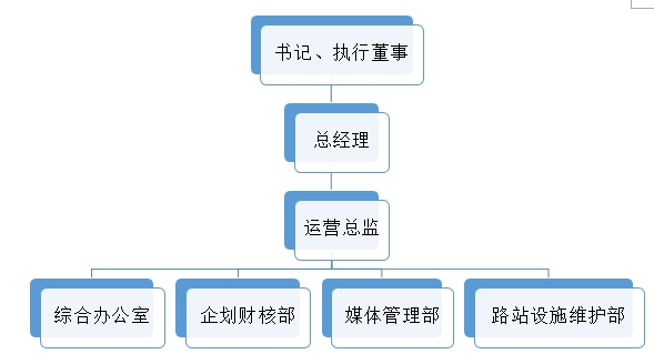为确保企业高效率开展好各项工作,按照职能优化、协同高效的工作原则,将企业部门设置为“三部一室”,即媒体管理部、企划财核部、路站设施维护部和综合办公室。