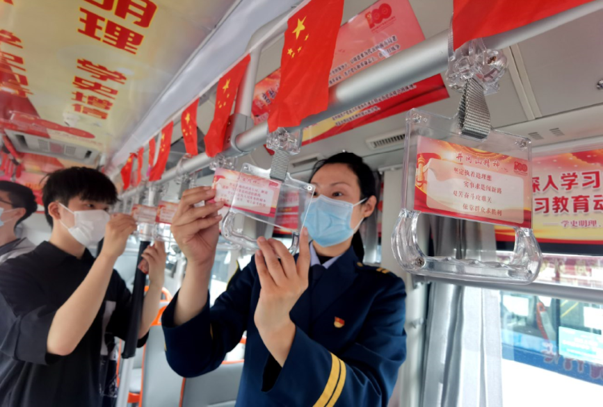 走进天津市公交集团第一客运公司5路驾驶员石霞的党史主题车厢,随处可见的红色元素扑面而来。五星红旗和党旗在两侧飘扬,车顶“1921-2021学史明理、学史增信、学史崇德、学史力行”的主题字样鲜艳夺目,两侧宣传栏贴有“学党史、悟思想、办实事、开新局”标语,拉手环融入了红船、井冈山和延安精神的红色卡片,车载视频中还播放着动人的党史红色故事,整个车厢生动展现出中国共产党波澜壮阔的百年奋斗历程,乘客们被浓郁的红色氛围深深感染着。