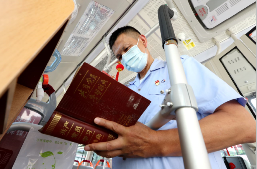 “欢迎您乘坐619路公交车,车厢内的党史书籍已消毒,可供阅读浏览。”天津市公交集团第二客运公司619路驾驶员回江涛在车厢内设置了“党史读书角”,党史书籍在乘客手中不断被传阅翻看,在墨香中感受党史温度,品味真理的味道,大家读得津津有味、不忍释卷。不少乘客还在车厢留言簿上饱含深情的写下献给党的祝福,诉说着对党的衷心祝愿和对祖国繁荣昌盛的美好期冀。“党的百年华诞是人民群众的盛大节日,我们希望用公交人最诚挚的方式迎庆节日,让更多的市民乘客都能参与其中。”驾驶员回江涛说。