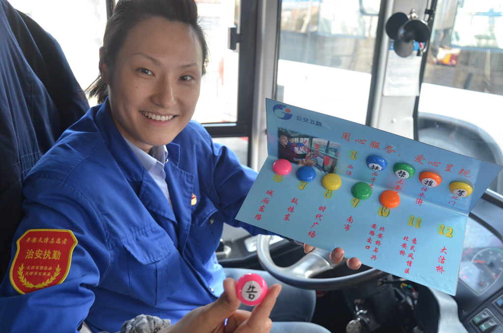 自从进入公交5路车队这个劳模辈出的先进集体,石霞就时刻以历届劳模先进为榜样,将自己的汗水融入公交事业高质量发展中。她一直坚守着“为乘客着想,让乘客满意”的服务理念,认真钻研创新服务举措,根据老年人、特需乘客乘车及路线行车特点,总结归纳出“服务五项承诺”“十二个多一点”“扶、等、提、帮、告”服务工作法,设计了下车铃铛和“用心服务 爱心呈现”提示牌,在车厢内放置了装有抽纸、雨衣、便条、花露水、充电宝等物品的温馨收纳袋,方便乘客使用。她还倾情打造了“雷锋精神进车厢”“国庆节主题车厢”“新年特色车厢”等,让乘客的公交之行变为爱国主义教育和传统文化学习之旅。